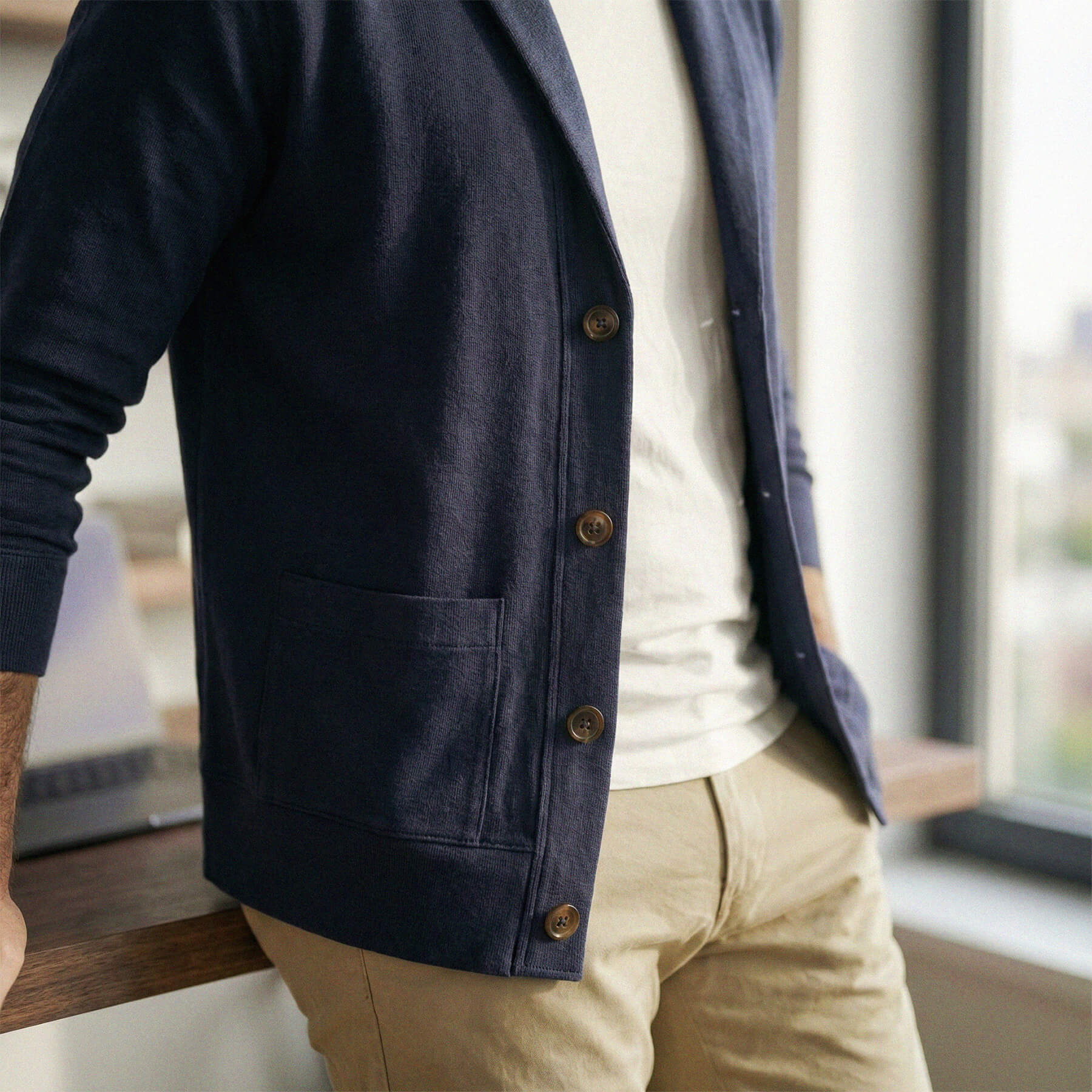 Et parce qu’on aime les couleurs faciles à porter, on vous propose le Cardigan col châle en bleu abysse : un bleu profond qui va avec tout, devenu un grand classique chez GoudronBlanc.